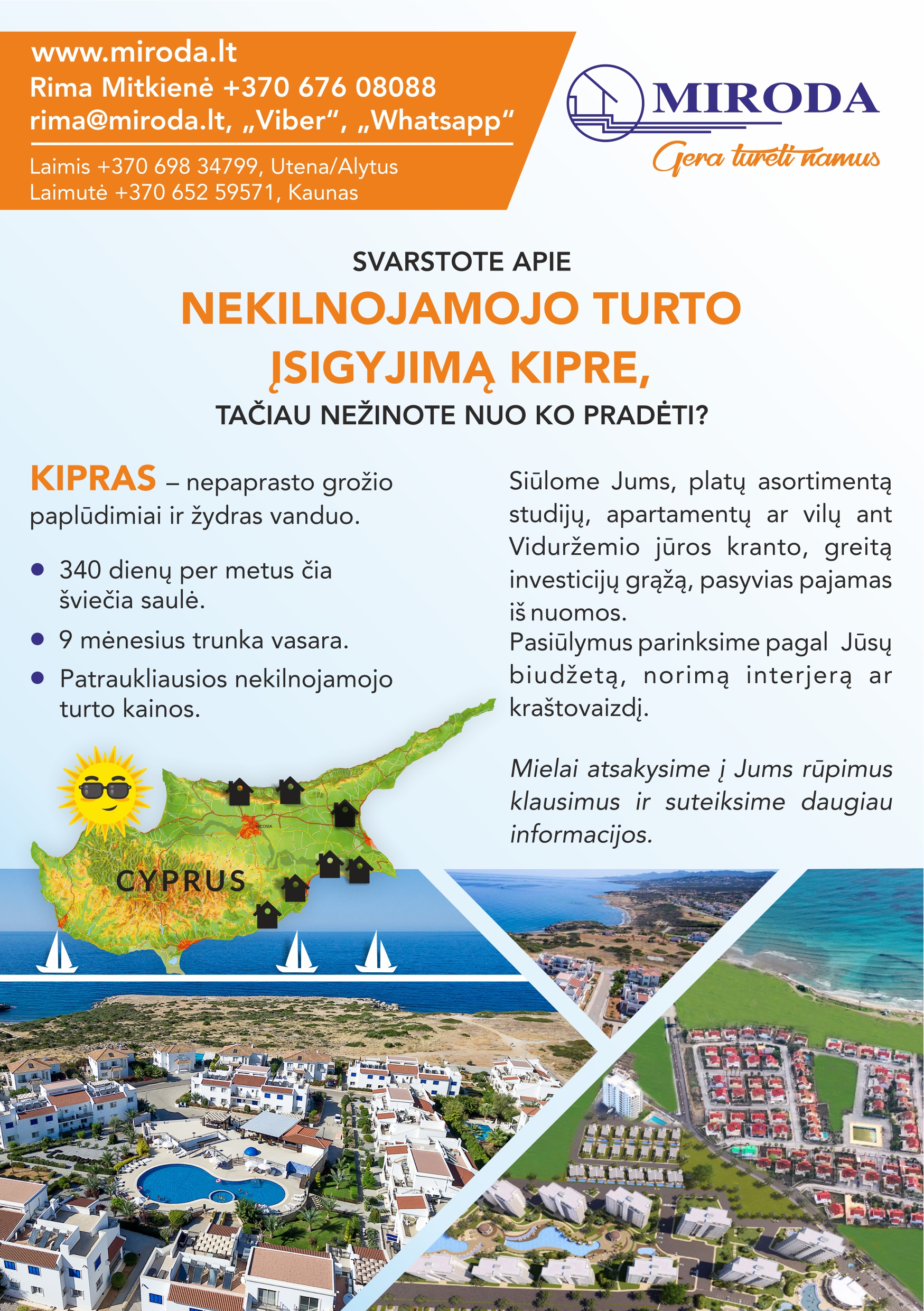 GERA TURĖTI NAMUS UAB „Miroda“ įsteigta 1999 metais. Pagrindinė bendrovės veikla – paslaugos nekilnojamojo turto rinkos srityje. Tai viena žinomiausių nekilnojamojo turto agentūrų Pietų Lietuvoje, pelniusi gerą reputaciją, turinti platų klientų ratą, kurių dauguma naudojasi įmonės teikiamomis paslaugomis, ne vieną kartą. Įmonė „Miroda“ teikia tarpininkavimo paslaugas perkant, parduodant, išnuomojant butus, namus, administracines/komercines patalpas, sodybas, sodus, mišką, žemės sklypus ir kitą nekilnojamąjį turtą Alytuje, Alytaus rajone, Lazdijuose, Prienuose, Kaišiadoryse, Utenoje, Zarasuose, Anykščiuose, Molėtuose ir kt. miestuose. Nuo 2018 m. dirbame su pirkimu - turto pardavimu Kipre.- 0 ( 0 balsų)